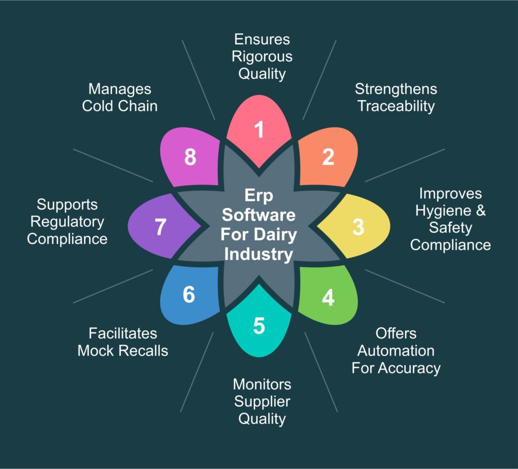 ERP software reduces risks like incorrect pasteurization temperature, wrong fat standards, or missed allergen checks by automating compliance checks and monitoring critical points in real time.